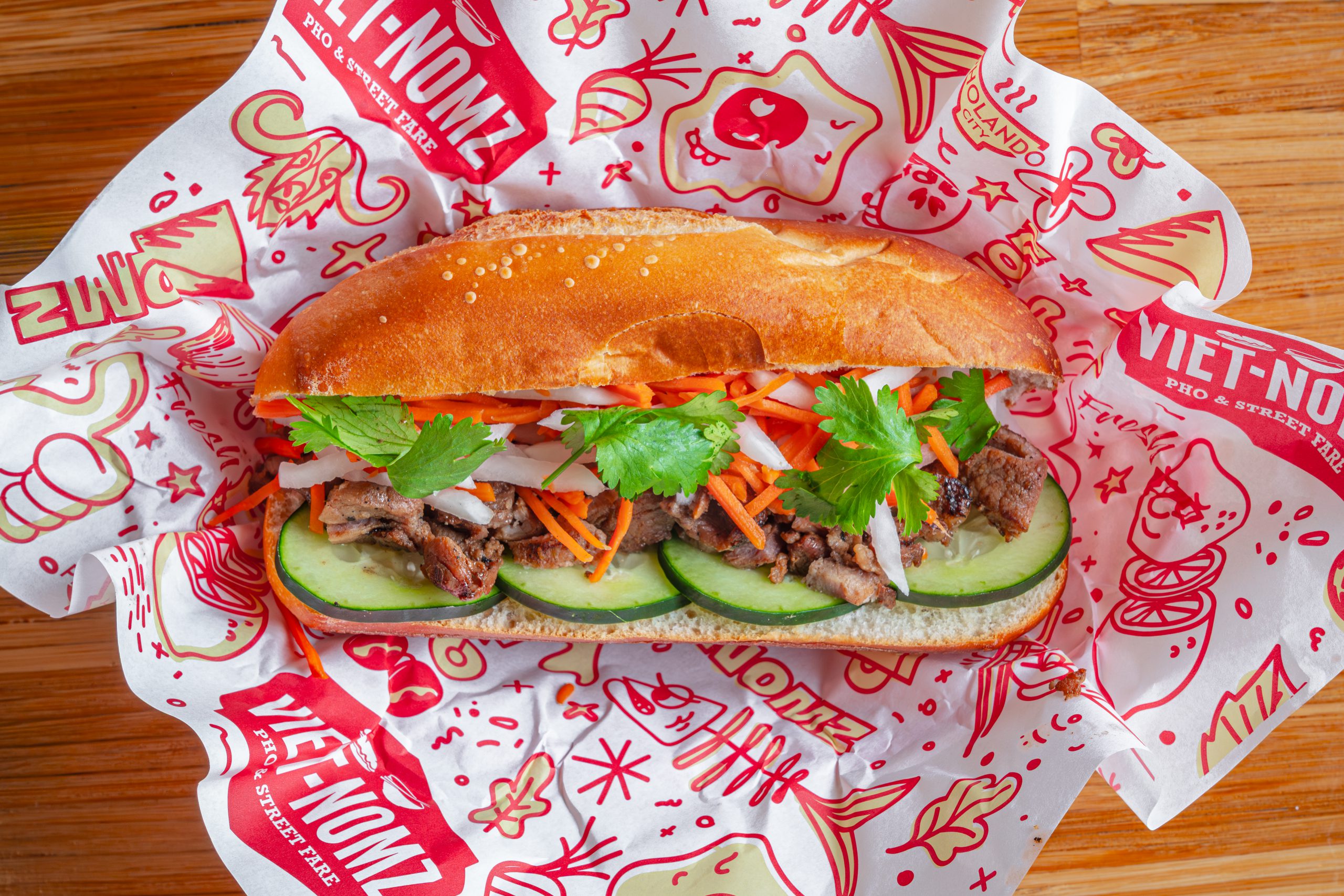 Vietnamese sub, served with your choice of protein, topped with pickled carrots & daikon, shredded cucumber, cilantro, and smeared with aioli butter on a french hoagie.