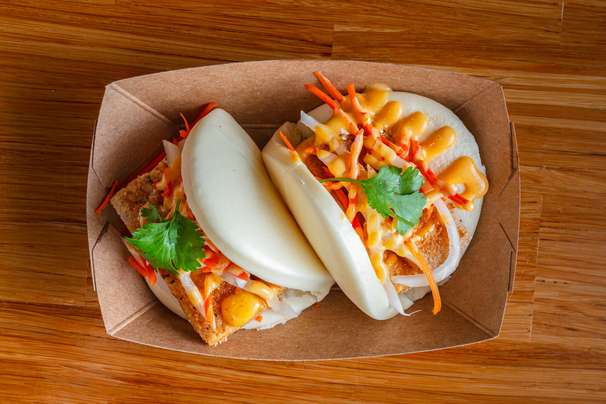 (2) Asian steamed buns, served with your choice of protein, pickled carrots & daikon, cilantro and drizzled with Spicy-Nom Sauce (Nom-Nom Sauce can be substituted or added no charge).