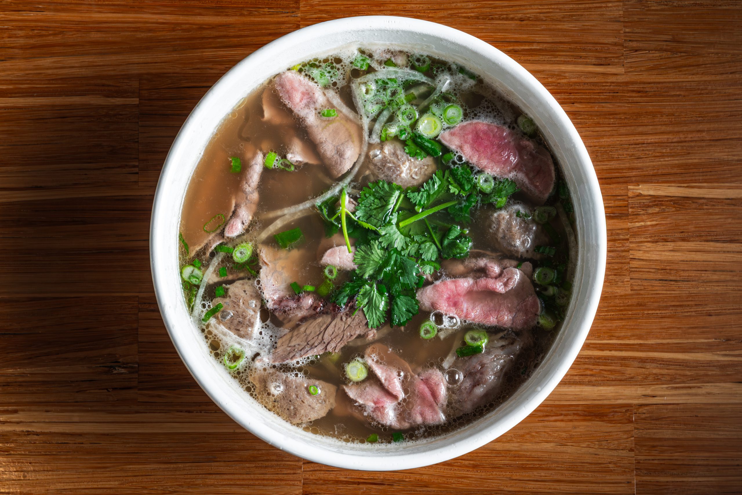 Vietnamese beef pho broth (XL bowl) with *eye round, beef balls, brisket and your selection of fresh vegetables at the Herb Bar.