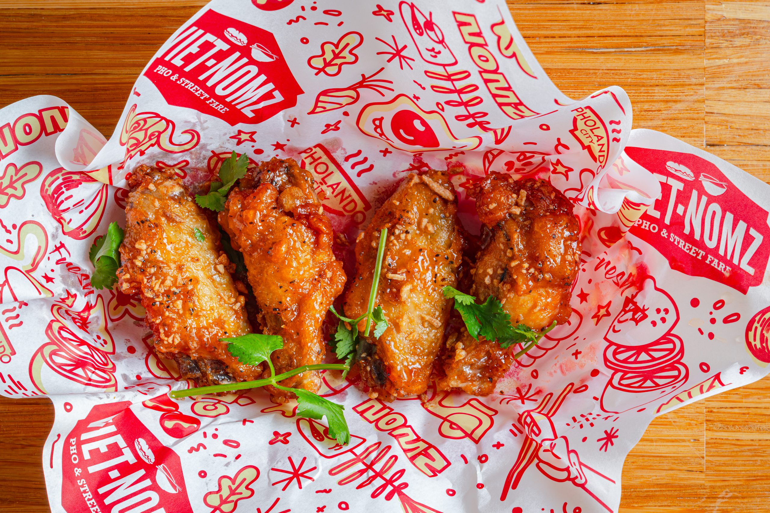 Jumbo chicken wings doused in our signature Nuoc-Nom Fish Sauce Glaze, topped with fried garlic and cilantro.