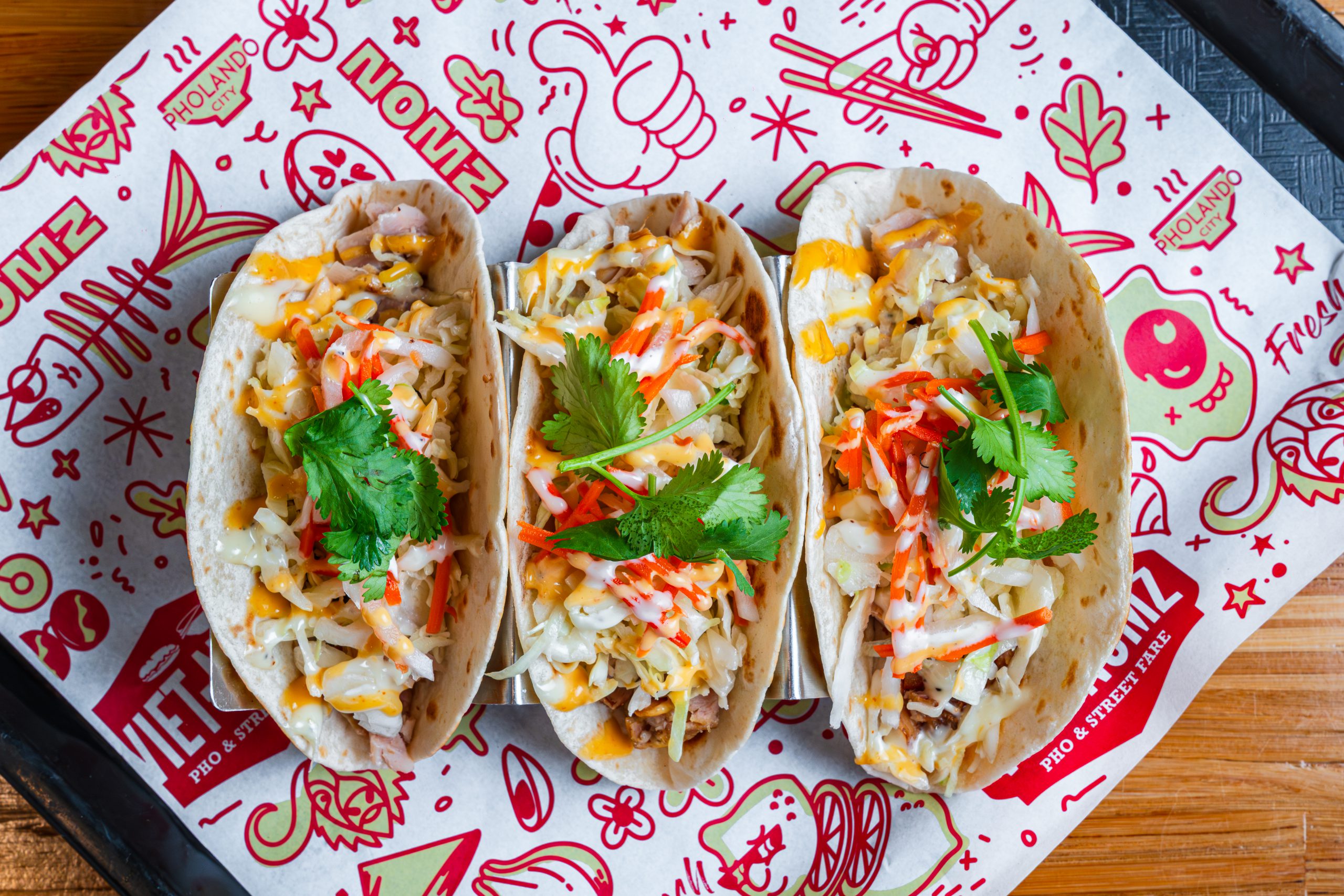 (3) Vietnamese street tacos, served with your choice of protein, topped with homemade slaw, pickled carrots & daikon, and drizzled with Nom-Nom sauce and Spicy-Nom Sauce.