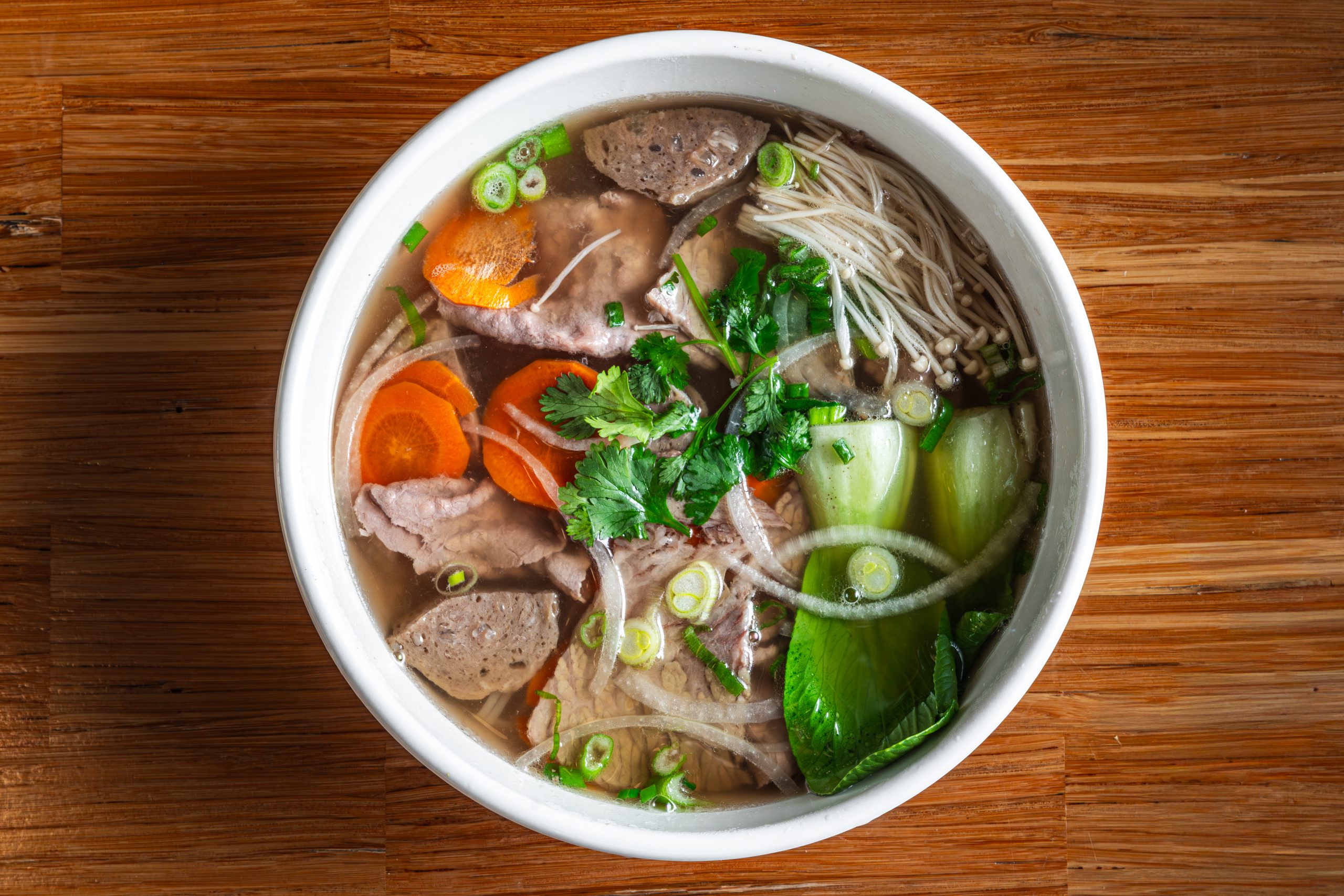 Vietnamese vegetarian pho broth with *eye round, beef balls, brisket, carrots, enoki mushroom, bok choy and your selection of fresh vegetables at our Herb Bar.